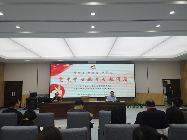 了解历史才能看得远,理解历史才能走得远。为更好地总结历史经验、把握时代规律、不忘初心、坚定信心、提高面向未来的历史主动和历史自觉,威廉希尔中文网站与校资产经营公司全体党员教职工于5月13日下午2点20分在员工事务中心一楼学术报告厅联合开展“学党史、坚信念、跟党走”党史学习教育专题讲座。本次讲座由自治区党委党史学习教育宣讲团成员,英国威廉希尔公司马克思主义学院的王立华老师主讲。威廉希尔中文网站入党积极分子、党员发展对象员工代表参加本次讲座。本次讲座由校资产经营公司党总支书记王贵俊主持。